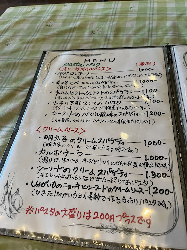 Read more味とコスパでおすすめです。双子座流星群を見に行った帰りのランチで寄りました。地元の方に教えて頂いて行きましたが…隣の弁当屋さんのノボリがめだって看板は気づきませんでしたが、可愛い感じの店構えです。パスタは¥1200-前後でプラス¥200-でパン、サラダ、コーヒーか紅茶が付きます。サラダもちょっとでは無く一人前の物でサラダチキンスライスが入っているなどお得! パスタは2種注文しましたが其々、美味しかったです。 店主は、あまり愛想はありませんがデザートも手作りでした。 コロナ対策も、...
