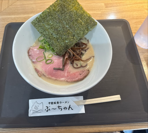 店名は山梨の地名「甲斐(かい)」と「貝(かい)」出汁をかけていますね。 そして豚骨で”ぶーちゃん”というのがわかりやすい^^ 貝出汁には、しじみや帆立など数種類の貝を使用しているようです。 しじみが入っているなら二日酔いももしや治るかも?😁