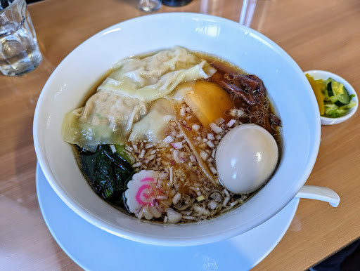 やや小ぶりな器の中には大きなワンタン・メンマ・味玉・チャーシュー・ナルト・小松菜・ネギなど。 幸楽時代と比べると気品の高さを感じる。 やっぱり東京からのクオリティは違うな~と。