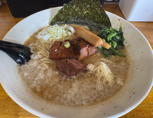 Read moreテレビを見て良さげなので伺いました、丁度オープン時間に到着奥様?が笑顔で迎えて下さいました。入店し左側の券売機で券を購入、豚骨醤油、大盛り券、餃子です。 店主さんにお渡しする際にニンニクは入れますか?と聞かれましたのでおすすめは?と尋ねると入れた方がいいですよ〜との事。 さて着丼。スープ熱い!ぬるいよりいい! 麺!中太わしわし!よい! チャーシュー…ほぼラフテーだわ、ライスに合うでしょうね。 スープ うお?アブラとチャーシューのタレで味が甘よりになっている。 私の好みですがあともう一押し塩気?ダシの塩味?があると感動するレベルになるかも! いずれにせよ凄く丁寧に作られているのはとても伝わって来ました、大事にしたいお店のリスト入りです。 次回も楽しみにしております。