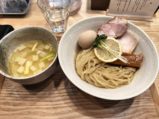 ■味玉昆布水つけ麺(塩) 小麦胚芽を混ぜ込んだ香りの良い太麺は軽く縮れていて、冷水でしっかり締めたものが粘り気のある昆布水に浸かって提供されます。 おすすめに従い、まずは麺に藻塩を少量かけていただくと、麺本来の風味と素朴な昆布出汁のコラボを楽しめます。「はじめは麺だけ食べてみて」と書かれていた中で一番美味しいです。コシのある食感も好みです。次に鶏出汁の出たつけ汁をつけていただくと、あっさりでありながら物足りなさを感じない絶妙なバランスに気付きます。レモンや黒七味で味変ができるので、全く飽きることなく完食できます。 レア気味のチャーシューと鶏チャーシューの2枚がデフォルトで乗るのも嬉しいポイント。味玉はトロっと半熟で満遍なく味が染みており、メンマは極太ながらとても柔らかく、素材選びと仕込みの良さが分かります。