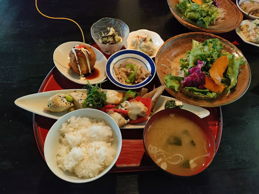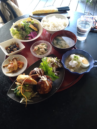 Read more民家で食事を出す、とても美味しいお店でした。 初めて来店しましたが、周囲は一戸建ての住宅街で、まさかこんな場所に……、なんて感じです。 外観は雰囲気作りなのか、蔦が張り巡らされていましたが、ちょっとした秘密基地ですね。 入口に近づくと、木造の建物にテーブル席が複数あるのがわかりました。 営業時間は11時から14時までの注文で、14時半までとなります。来店は13時を過ぎていたので、他のお客様は誰もいなかったです。 店主の女性もこの時間の来店に少しだけ驚いていました。 さて、メニューは2種類。日替わりランチとそれにデザートが付いた物もだけです。とてもシンプルです。 数分後に運ばれてきたプレートの上に、かなりの種類がのっていて、これは想定外ですね。 一つ一つが手作りで、とても優しい味付け、スッキリした感じでした。これは写真にありますが、是非食べに行って欲しいですね。 デザートはコーヒーとよもぎのケーキです。一口食べるとよもぎの風味が口の中で広がります。 気がつくと、かなりの満腹感。 本...