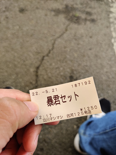 食券を買って並びます。 取り合えず中に入ってメニューを確認する。 マシライスとすごい冷やし中華で悩んでいたが、滅多に来れる場所でないため同時に喰える方法は無いか悩む。 ラーメンとマシライスのセットはあったが、冷やし中華とマシライスのセットは無い。凄い冷やし中華を注文してハーフマシライスにするか? マシライスを理解していないのにそんな注文していいのか? 豚はついているのか?量はどれくらいか?本店を含めた今までの二郎系の中で一番迷いました。マジで5分くらい悩んで最終的に暴君セットを注文。取り合えずマシライスで一番値段の高いこれを注文すればマシライスに関しては制したも同然。 取り合えず食券を購入して外に出る。 家族向けに外でも食える様にテラスがある。 でも食べている所を順番待ちの客が居た場合、思い切り見られる事になるので自分なら嫌かなぁとは思った。