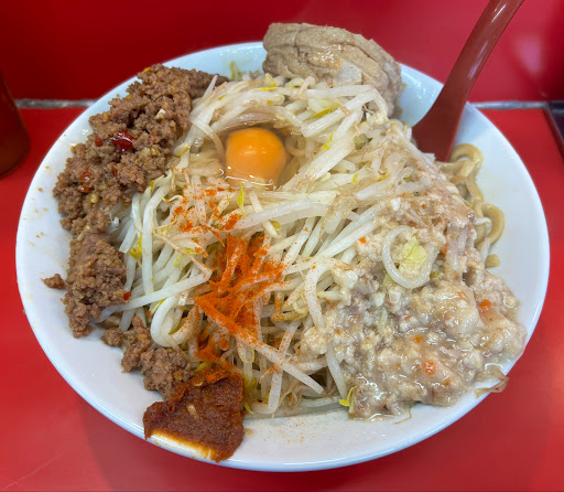 豚は見た目通り固かった。これはタイミングと運だから仕方ない。 ボリュームも他店舗と比べると大きさもそんな無い感じ。 次は注文し無くても良いかなとは思った。 隣の兄ちゃんが食べていた脂?が入った皿が気になった。 机に貼られているトッピングには無い、カロリー高そうだが食べてみたい。次回来ることがあれば課題にしようと思う。