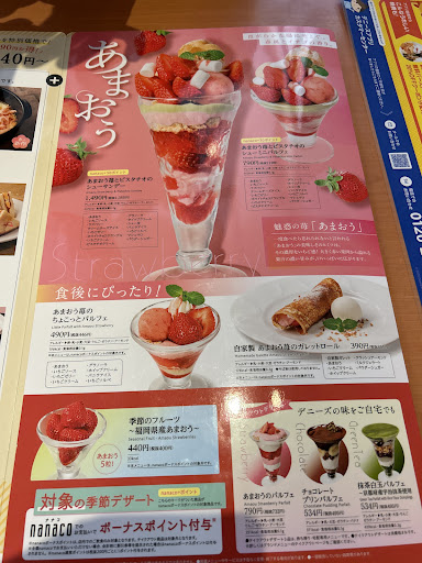 Read moreあまおうパフェ、なぜかココスと同じようにピスタチオが追加されていた。ピスタチオならチョコの方がいいのに。パフェ1つで1500円です。あまおうだし、仕方ないかと。でも高い。あまおうは甘くて美味しいけど、ピスタチオの青臭さが邪魔をしてる。お金をかけるならピスタチオ抜きにして安くしてくれた方がありがたい。12/29再来店。いもパフェを食べにきた。いもは凍ってます。上にかかっているクリームは、程よい甘さでクリーミー。あずきと白玉も入っているので、食べ応え充分。プリンはいものねっとり感を再現してます。お腹いっぱいで食べたのでヤバいです。 あまおう、再度食べにきました。 前よりもイチゴが小さくて酸っぱくなってました。新鮮さも何だかちょっとないような。中にはスポンジが入ってました。 ドリップコーヒーはおいしくないです。 仕方ないかと思いながら飲むコーヒーです。 2025.7月、再来店。 桃のパフェ目当てに来ました。 税別1980円です。高い!サンデーに変更しました。ドリンクバーは450円もする!せいぜい一杯ぐらいしか飲まないので、元が取れない。ちょっと高すぎるのでやめました。せめて398円くらい...