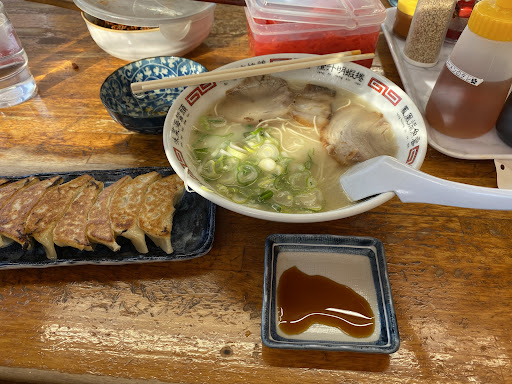 スープは しっかり豚骨の香りが立ち、ほんのり甘みもあって、いわゆる長浜ラーメンらしい味。クセはなく、昔ながらの味に ほっとする。麺は やや細めながらコシがあり、噛み応えが心地よい。チャーシューは三枚。脂っこさは控えめで、こちらも懐かしさのある味だった。 辛子高菜が かなり辛めで、これがスープに合う。卓上には他にも紅ショウガやコショウ、ニンニクなどが揃っていて、味変しながら楽しめる。小鉢に自由に取れるモヤシ(ナムル風)、タクワン、梅干しのようなものまであり、ちょっとした お得感もうれしい。 水はポットからのセルフだが、最初に大きめの氷を入れてくれるのが ありがたく、こういう気配りが暑い日には特に嬉しい。何より印象的だったのは、店の方の接客。明るく声を...