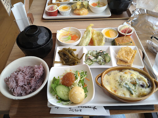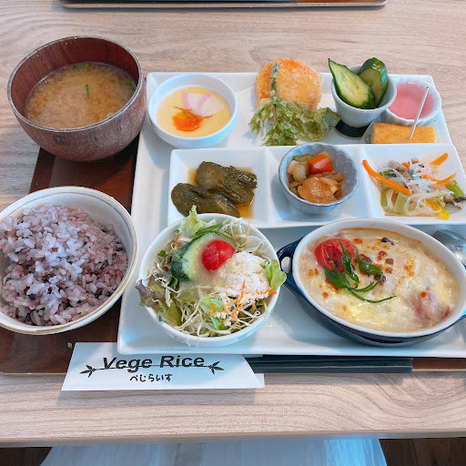 Read more近くで用事があったので調べてこちらでランチを先月も近くに来たのに寄ってる暇なくて… ようやく行けました。 周りにるシオールの建物がいくつか ひらけたところにあるのでゆっくり行けばこちらがるシオールのレストランべじらいすなのはわかりました。ちゃんと調べてなかったら お店の名前違う…どこ…?ってなるところでした。 平日の11:30頃入店 待ちはなかったですが駐車場も店内も割と満員状態でした。 ちょっと値は張りますがせっかくきたので 季節のプレートを注文 色々な野菜が細々とカラフルに盛り付けられていてわくわくしました。食べていてとても楽しい食事でした。 好き嫌いなく よく食べる方なのでペロリと食べられました。 どれもとても美味しかったです。 季節の天ぷらはナスでした。 お味噌汁は甘い味噌汁で具沢山でした。 野菜たっぷりハンバーグはどちらかというと おからバーグみたいなほろほろとしたハンバーグでした。 美味しかったけど肉肉しいハンバーグを想像してしまっていたのでちょっと残念。