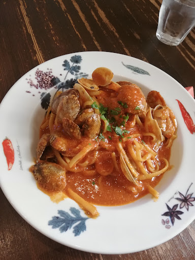 Read more明治亭目当てで訪問しましたが長蛇の列で、ほぼ同じ敷地内と言っていい場所にあったこちらでランチ。 お店の雰囲気はカジュアル。値段も手頃。 家内はピザランチ、私はパスタランチを注文。 値段も手頃だったので小さめだろうと思いきや、先に来たピザはかなりのサイズ。2人で半分ずつ食べ、お腹がいい感じになるくらいのボリューム。 野菜がたっぷり載っていて、味も美味しかったです。 それを食べ終わった頃にパスタを出して下さったのですが、こちらは盛り付けからしてすごかったので、思わず写真を撮影。 野菜の素揚げがのった冷製パスタでしたが、野菜の素揚げがボリューミーで、これまた美味い!麺はほんのり甘めのトマトソースをまとい、いくらでも食べられる。たっぷりのトマトとジェノベーゼソースは最後余るので、一緒にきたバゲットにつけて食べると、これまた美味い。 次回はこちら目当てに訪問して、他のメニューも食べてみたいと思い...