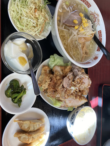 大粒の焼き餃子が、6個、お肉がぎっしりで美味しいです。ご飯は、小さい茶碗ですが、しっかりご飯を入れてきているので、 見た目よりも多いです。 そして、小学生のこぶし大の、熱々の唐揚が、2個、胡椒がお皿の横に添えてあります。こんなに大きいのにジューシーに揚がっているのは、不思議。