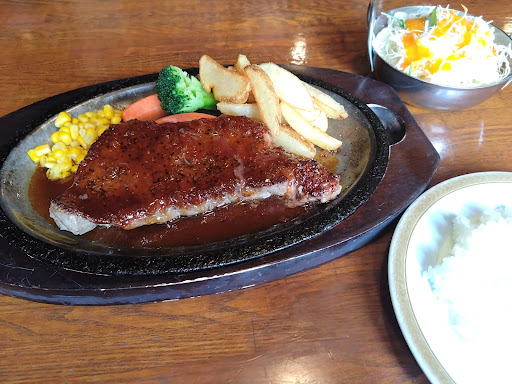 Read more日曜の昼過ぎに来訪 ステーキ、ハンバーグなどのほか、ラーメンや酒のつまみになる一品料理まで豊富なメニュー。 相方がステーキセット(250g)、当方がポークステーキを注文。 ボリュームもあり、程よく脂も乗ってご飯が進むソースでどんどんいけました。 ぜひとも再訪し、次はステーキ丼ととんかつ定食、ラーメンも気になるね、と話しながら店を出ました。