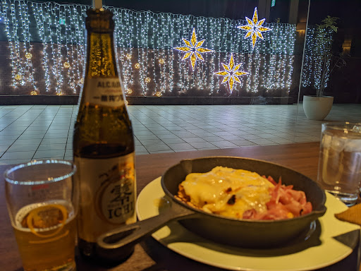 2022.12/28…仕事納めの日の夜、此処で セルフ労いデナーを楽しむ事に決める。 同じ建物内の「ブリックカフェ」の方は、今迄 幾度となく食事したが、此方は 初来訪。 いつもの入口ではなく、其の右方から入店。 誰も居ないエントランス?に、一瞬 逡巡。 通されたホールには、他には 客は居ない。 案内された席は、目の前に美しいイルミネーションが輝く 特等席。 メニューブックをチェック、3種類有るラクレットからセレクトしたのは、生ハムとラタトゥイユカンパーニュパングリル。 ブリックと共通 と予想した通り、スウィーツメニューは一緒(食事メニューも、所々同じ)。 と云ふ訳で、前回 かの店で sold out だったチェリータルトをセレクト。 但し、あちらには有るカプチーノは 生憎 無く、泣く泣く?ブック チェック。 結果、「ゴールデンサマーダージリン」に。 最後迄 業務に勤しんだ自分を、鮮やかに 華やかに? 労って、慈しむ様に寛ぐ。 尚、入口直ぐの空間の正面、一見 トイレが在るとは思へない緑の壁?の向こう側に、向かって左が女性用、右が男性用(写真参照)。