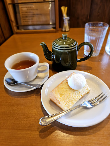 紅茶は数種類で600円のものはポット提供。 茶器は温かくないですが、冷たくもありませんでした。 ポットの中はティーバッグになぜか茶こし。 ティーバッグが1つなのにカップ3杯分あるので、少し薄かったですが 味は好みに近い方でした。香りがよかったです。 サービスのシフォンケーキは思ったより大きく、ふわふわでした。 でも、自分には甘かった.