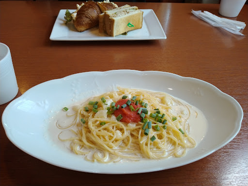 クリーム明太子パスタ美味しかったですよ。 少し口の中が重かったので、ケーキはフルーツ杏仁豆腐にしました😋うまうま💕 友人のサンドイッチランチはロールパンのサンドは美味しかったけど、食パンの方は固かったそうで、ちょっと不服そうでした。