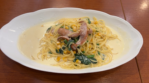 注文したのは、ランチパスタの「ソーセージ、コーン、ほうれん草のクリームソース」とピッツァの「トマトとバジル」を注文。