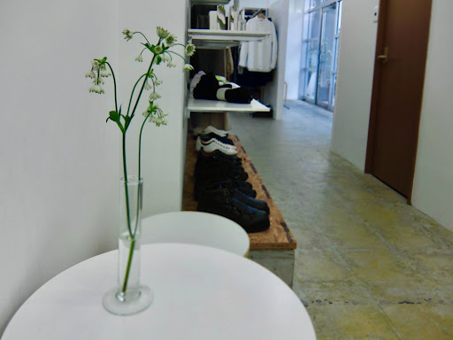 駐車所は前にあります。 店内は右はメンズファッション店。 左が白い空間に小さな小窓があり、先客がいないとカフェと分からないかもしれません。