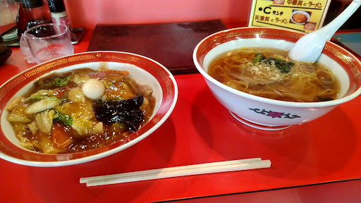 Read more粟津駅前の中華屋さんにランチ。ABCあるうちBを選びました。 【中華丼とラーメンのセット】 中華丼は白菜、人参、キクラゲなどなど大きめに切られた野菜がたくさん!!餡は濃いめの味付けのためご飯が進みます。ラーメンはアッサリめの醤油味でした。 中華丼・ラーメンともに普通サイズですのでボリューム満点です。コレが1000円以内で食べ...