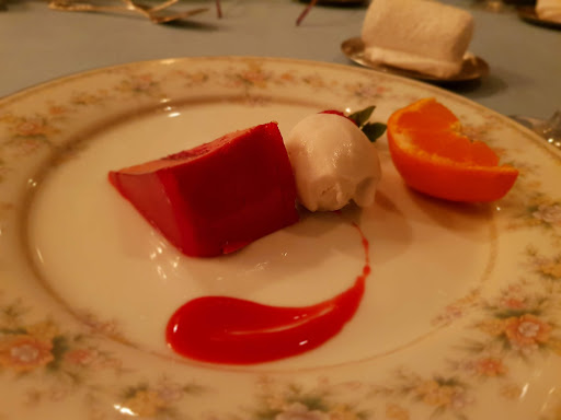 アミューズ(フォアグラのムース)から始まり、前菜、季節のポタージュ(グリーンピース)、お魚料理(この日は鯛でした)を頂いて、メインが来るまで時間がかかるからと口直しにシャーベットまで頂けました🥹