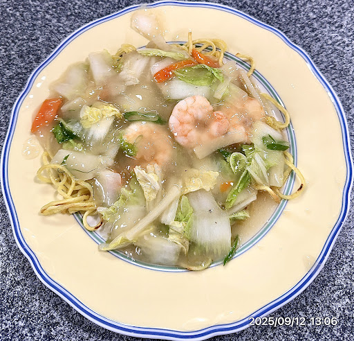 こちら錦さん店名に中華料理と入っていますがおよそ中華料理店らしからぬどちらかと言えば喫茶店っぽいその店内とのギャップが凄いです(笑)。実は私、約1時間前に金沢市内の某町中華のお店でえびラーメンをいただいておりまして連食二軒目、北陸出張の締めとしてこちらで海老揚げソバをいただく事に。いわゆるエビ繋がりで(笑)。入店時は既に13:00少し前。前客はカウンターに1名のみ。店員さんと世間話されてるところをみると恐らく常連さんですかね。さて、オーダーは「海老揚げソバ」!頼んで直ぐに後客1名様が御来店。速攻「中華風カツ丼」をオーダーされてました。美味いのかなぁ?興味深々。そんなこんなでオーダーした海老揚げソバの到着です。内観同様、盛り付けされたお皿もおよそ中華料理店っぽくないお皿(笑)。元はホントに喫茶店か?卓上のお酢を回しかけてカラシをつけてって探してみましたが卓上グッズには見当たらずでしたのでとりあえず一口パクっといただきます。揚げ具合がちょうど良いソバをお酢と餡に絡めて食べ進めてゆきます。カラシが無くても結構いけます。海老は3尾、チョット残念でしたが塩ベースの餡が実に奥深い味でパリパリの揚げソバによく絡みます。ボリューム的には一皿完結にはちょっと少なめかなぁ。ま私は連食ですので問題無し(笑)です。美味い揚...