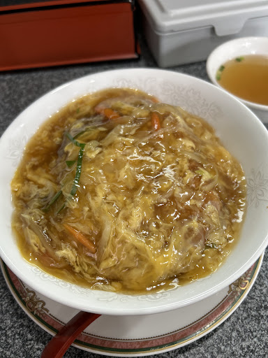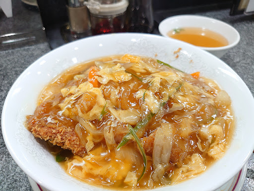 中華カツ丼は注文を受けてから揚げ始めるのでトンカツはサクッとした仕上がり。カツはボリュームある大きさなので丼ぶりを円を描くように乗せられてる。何が“中華”かと言えば普通のカツ丼がダシで煮込み、卵でとじるのに対してコチラはアツアツのあんかけを上からぶっかけるスタイルな事。あんかけはネギ・玉ねぎ・ニンジンとトロトロの卵が入っていて、お味は本家カツ丼のような優しい甘みが特徴的。トンカツの旨味を引き立てると共にご...