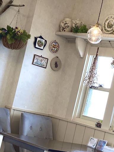 小さく可愛らしいお店で2人席が1つ、4人席が3つあります。店内はギターとハープの音楽がゆったりと流れています。