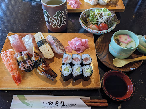 昨日の名古屋は38度超えで今日も37度予想…。 火曜日には頭まで痛くなりかなり危険な温度でバテて来た。 嫁さんもバテて来てるのでさっぱりと寿司でも食べたいとこちらに来てみました。 こちらもランチメニューがあります。 刺身がついたAランチと、サラダ、デザートがついたBランチがあり、Bランチ(税込1,430円)を注文してメニューの配膳を待ちます。 昔ながらの初寿司の建物ですが、座敷席はテーブルとなり、膝の悪い高齢者にはいいですね。 ただ待てどもなかなか配膳されない。 開店と同時に入店して最初のサラダが配膳されたのが30分後でした(-_-;)。 シーチキンの入ったサラダですが、これだけ暑いので冷やして欲しかった。 メインが登場は40分後でした。 にぎり、軍艦で7貫ありまた生しらすも美味しそう。巻物は小さいですが一口サイズで食べやすいですね。 でもシャリかなぁ? なんか美味しくなくて…。 穴子にも甘ダレが欲しかったなあ? 茶碗蒸しは久々に食べて美味しかったし最後のデザートの牛乳プリン?はトロトロで…(笑)...