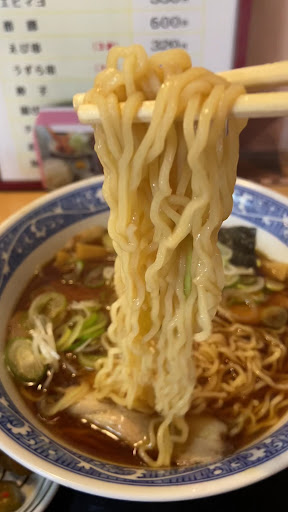 ラーメンは醤油が甘めの濃いめのスープ。麺は細めで軽くちじれあり、具は薄めのチャーシュー3枚、メンマ、海苔、ネギとオーソドックスな中華そばという感じ。唐揚げはカラッとあがり、一つが大きめで半分に切ってある。しっかりとした味つけで美味しい。 セルフコーナーがあり、たくさんの調味料や薬味などが自由にとれるようになっていた。便利〜