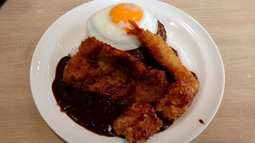 トッピングは、 チーズINハンバーグ、目玉焼き、海老フライ、うすカツ、唐揚げ。