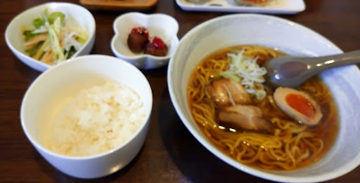 今日も晴れてるが寒い‥(涙)。 昼はやはり温かい麺が食べたいと検索していたらこの店を発見。 駐車場は店の前になんとか3台は止められますが満車‥。 北西に第2駐車場があるとかで探すと灰色の倉庫の西側のアスファルト上に「森の食卓」と書かれていたためそちらに駐車です(写真の通り)。 日曜日もランチメニューがあり、メニューも豊富で創作中華といった感じの店ですね。 小上がりの席に案内されたが、堀ごたつで「寒いでしょうから、湯たんぽで温まってください」と案内(笑)。 また内履きのスリッパまで用意していただきかなり雰囲気もいいです。 天津飯も気になりましたがやはり麺が食べたい。 嫁さんはオススメメニューが気になったらしく「ふわとろ卵のあんかけ五目ラーメン」(税込850円)、私は醤油ラーメンが気になり「麺ランチ(森食ラーメン)」(税込800円)を選択してメニューを待ちます。 ご飯は大、中、小が選べますがそんなに食欲もなく小にしてもらいました。 他に2人で「餃子、8個」(税込480円)を追加しました。 メニューは15分程で配膳されました。 醤油ラーメンに肉団子、サラダの小鉢がついて、デザートにはコーヒーゼリーがついておりさっそくいただいてみる。 醤油ラーメンはスープが澄んでいてシンプル醤油といった感じでスープは美味いが麺がかなり太い麺。 この麺なら味噌のが良かったかな⁉️と私的には細麺が好みなので‥。 チャーシューは分厚く柔らかなチャーシューでした。 チャーシューフェアをやっていてチャーシュー麺も良さそうですね(笑)。嫁さんのメニューはキクラゲ、タケノコ等細かく刻まれたあんかけスープでこちらも良かった。 餃子はちょっと高めでしたがニンニクも入りパリッと焼かれ美味い。 小鉢の肉団子だけは普通ですね。 最後のコーヒーゼリーは口の中がさっぱりさせてくれて甘くないのがいい...