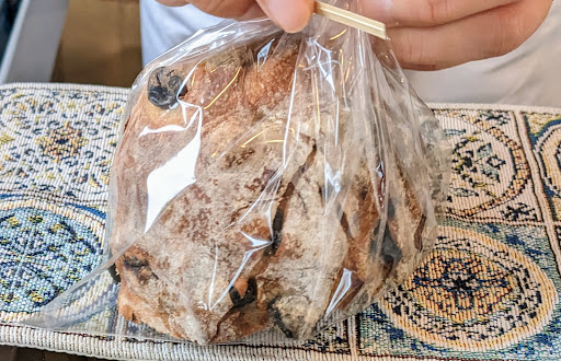 12:15頃来店、既に[完売]の看板が・・・ でも、どんなお店なのか気になり店内にショーケースは空っぽでした。ですよね! でも、店主さんが「ノワレザン柚子がひとつ残っていますよ」と言われ、(ノワレザン!?レーズンとくるみのパン・・・どんなのかなっ) 奥から持って来たので購入しました。 ハードタイプ、国産石臼挽き小麦と米麹の酵母でゆっくり手間と時間をかけてこだわってました。 パン生地は全粒粉でレーズンとくるみがたっぷり入って柚子ピールが美味しさを引き立ています。