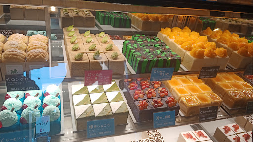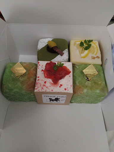 以前来た時も気になっていた、ショーケースのケーキを今回は購入して帰りました。 こちらは、店内では食べられないようでテイクアウトのみだそうです。 はちみつクリームレモンのせ、夕張メロン2つ、フレンチ・ストロベリー、抹茶あんショコラミニパンの5点を購入。(1つ370円) 帰って食べると、あれ?パンだ〜という感じで、新感覚でした。 後から調べると、人気の子犬のワルツというミニキューブパンでした。