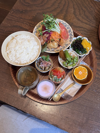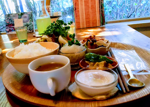 Read more一緒に行った知人のおうちのお気に入りのお店。土日がお休みなので行きたいけどなかなか行けないらしく今回ちょうど良い機会で行くことになった。 窓の外に広がる明るい緑をお店の中に借景として取り入れていて、とても素敵な空間になっちゅう。ガーデナーの憧れのターシャさんの本が置かれてあるがを見て納得。 ランチは前日に予約済で、品数も多くヘルシーで美味しかった。食後にデザートをと思いその日のケーキの種類を聞いたら、焼きたてのカヌレを含め3種類があって、どれも美味しそうだったので決めきれず、全種類を1個ずつ注文したら、「全部半分に切りましょうか?」と言ってくださって、それぞれのお皿で出してくれたので全部の味を堪能できハッピー。٩( ´◡ )( ´◡...
