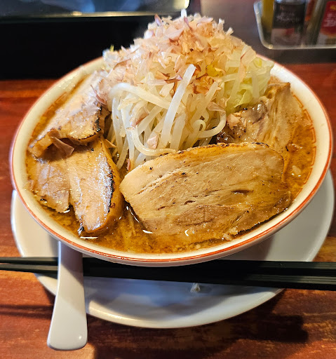 Read more二郎系ラーメンのお店。野菜、油、にんにくはちょいマシ、マシ、マシマシなどを選べますが、麺の大盛り、特盛りは有料です。 二郎系といいつつ、スープは魚介、特に鰹だし?がとても効いており、『むつこいが』(土佐弁で、脂っこいというような意味)というラーメンでありながら、あっさりした後味で、この店オリジナルと言ってもいいと思います。 野菜マシ程度なら、普通に食べれると思います。野菜マシマシは、ちょっと気合いを入れて。まあ、しょせんはモヤシですから笑 ただし、メニューにも書いてますが、ニンニクや油のマシ加減は自己責任で・・・ がっつりラーメンを食べ...