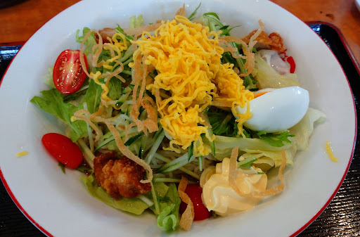 Read more昼に江南市内の中華料理店に行ったら、コロナの影響で夜のみの営業になっておりガックリ⤵️。 行きに建物が新しくなったこの店の前を通りかかり5年ぶりに訪問です。 ちょっと夏バテ気味で冷たい冷やし中華が食べたい。 メニューを見てみると冷たいメニューはざる中華もある。 ご飯まではいらないので、私は「冷やし中華」(税込780円)、嫁さんは「ら~めん」(税込550円)に「餃子」(税込340円)を2人前注文しメニューを待ちます。 店は盛況で満席。カウンターに隣り合って座りました。 まず餃子が登場。 8個もついている。 1個1個が小振りですが皮パリに焼かれたこの餃子は美味しいです。 嫁さんのら~めんがまず登場。 550円で薄いチャーシューが入り、これだけの内容なら安い。 昔ながらの中華そばの感じでメニュー選択に失敗したかと後悔かな⁉️ 私の冷やし中華も時期に登場。 マヨネーズ付きがこの付近の定番で、ここは最初から盛り付けてあります。 レタス、ミニトマトがシャキシャキで美味いし、麺が細麺で酸味のきいたタレと合わさり、昔ながらの冷やし中華の味ですが、チャーシューの代わりが唐揚げ‥。 これは私にとっては残念です。 やはりチャーシューのがいいなあ⁉️ 昔からあるこの店。 涼しくなったらまたあの懐かしのら~めんをいた...