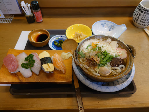 GW中に訪問させていただきました。 お昼前でしたが店内お客さんなしで1番乗り、ですが連休中は突発の貸し切り等あるようですので注意が必要かと。 訪問時はまだ肌寒かったので京風鍋焼きうどんと寿司5貫セットを頂きました。 ランチなのに提供時は大旦那さんがその都度ネタから切って握ってもらえるというなんとも贅沢な定食です。 当然ながらネタの鮮度は素晴らしくどの寿司も絶品でした。 エビアレルギーを伝えるとじゃあ入れませんねと対応頂けたのも有難い限りです。 うどんはかつお昆布以外にも寿司屋さんで出る魚の出汁を引いてらっしゃるのかうま味が凄いです… 具材も丁寧に仕事されており流石お鮨屋さんという仕上がりのおうどんでした。 このクオリティで1500円は割安通り越して破格だと思うのでお鮨好きな方は...