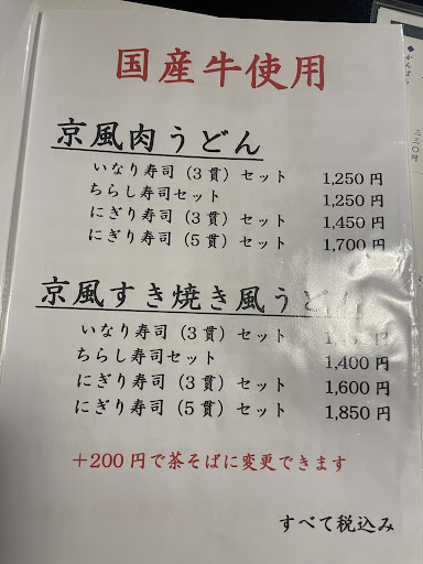 カウンター席と4人座敷が2つのこぢんまり したお店でした。 私は京風肉うどん握り5カンのランチ1700円 嫁は天ぷら定食1540円 義母は煮付け定食1540円を注文です。