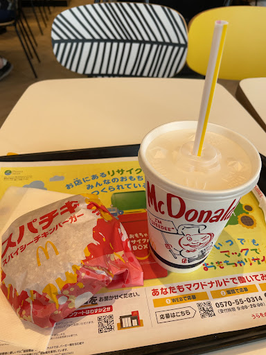 濃厚とろ〜り月見バーガー420円、月見マックシェイクS130円をオーダー。ハンバーグの薄さに驚きました。 スパチキ200円、マックシェイクM200円を注文。スパチキは一口食べて駄菓子かと思った。酸味のあるスパイスが特徴的。 朝から結構、混んでます。 ソフトツイスト