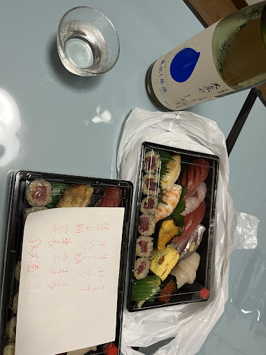 子供が遊びに来た時にここのお寿司を見つけてきた。酒が飲みたくなるので「おまかせ握り」なら持ち帰りが出来ると書いてあったので2人前頼んだ。@3190×2で回るお寿司より高かったが美味しかった٩(ˊᗜˋ*)وシャリに色がついてたが味はよく分からんかった、量も少なかったが刺身だと思えば満足!おなかいっぱい!ただ、食べ物屋さんなのでもっと気をつけた方がいいと思った。よけて食べたので問題なし!「暑いので保冷剤とかあった方がいいですよ」と教えてもらったのでその通りに持ち帰り美味しくいただた。マグロ、ホタテいやー美味かった、満足(#´ᗜ`#)お酒は地元から取り寄せたものでサイコーに美味かった。埼玉のお酒も何本か飲んだが、米所出身なのでやはり地元の勝ち!この寿司と酒、(地元の酒なので店には無い...
