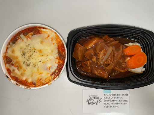 2021.8.27 豚肉の料理730円、ラザニア560円を持ち帰りで注...