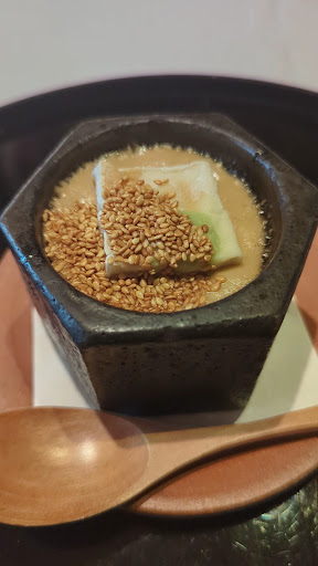 ・ホタルイカと豆腐 with 山椒のアクセント ・前菜盛合せ: 平貝、燻製サーモン、 カラスミの磯部焼きなど ・ウニと豆腐のお吸物 ・お刺身盛合せ(まぐろ, ヤリイカなど)、とらふぐ ・銀鱈の西京焼きと麩 with 山わさびスライス (妻の料理: ホワイトアスパラガス with 卵黄) ・うねめ牛(うねめ: 地元の伝説の女性) ・黒ムツ、鯛の白子、麩の入った昆布出汁のスープ with 柚子風味 ・ちらし寿司、お吸い物 ・わらびもちと抹茶のソルベ with 和三盆シロップ
