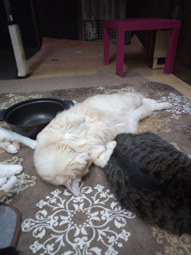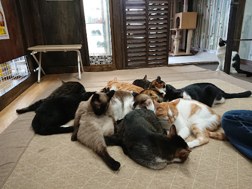猫ちゃんは15匹くらい(あやふやですみません)います。みんな、のーんびりと寝ていて人間が入ってきても怯えた様子などはありません。人間がどーんと座って待っていると、少しずつ寄ってきてくれて…膝にも乗ってきてくれたりして… ほんと癒される~( ᐡт ̫ т...