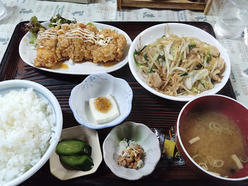 明日、いわきで高校野球の県大会を観に行くので前日入りするのに うちのと途中で買い物しながらランチで初めて伺いました 駐車場が隣の焼肉屋さんと共同の事もありいっぱいでしたが運良く出る車があり停めることが出来ました 駐車場は十数台停められたかと思います 待たれてた方もいたのですが タイミング良く出られた方もいて テーブル指定もしなかったので カウンターに2人並んで座る事が出来ました 満席の場合は記入して入り口か店外で待つことになります それと、待つ際に入り口を開けっ放しにすると冷房中なので閉めて下さいとお願いされます 元気な店員さんが案内してくれて お冷を持って来てくれました 注文はテーブルにある紙に記入して店員さんに渡します カウンターにはメニュー表は無くオススメのボードと壁に貼られたポップから選びます 沢山、メニューがあるのでかなり悩みましたが 自分はオススメの得々セット うちのはてりやきハンバーグ定食にしました 中央のテーブルがカウンター席になって居るのですが振り向くと厨房が見えるのですが炒め物をしている時のフライパンからの火か見えて凄く熱そうでした 今日も、凄く暑かったので凄く大変だなぁと思いました 自分の職場も凄く暑いので凄く苦労が分かります うちののハンバーグが先に来ました 熱々の鉄板の上にハンバーグが来ました 小鉢にサラダと納豆とお新香が付いてきました 自分も一口もらって アッアッで柔らかいハンバーグがとても美味しかったですが 自分は大病してから食事制限しているので自分には少し味が濃かったです 少しして自分の得々セットが来ました 鶏南蛮と野菜炒めのセットでした お新香と豆腐と納豆とご飯と味噌汁が付いてきました 鶏南蛮も野菜炒めもアッアッで美味しかったですし さっぱりしていたので バクバク食べれたし副菜やご飯も美味しかったです ご飯も女性には少し多いかも 味噌汁は自分には少し濃かったです 汁だけ残しちゃいました ごめんなさいm(_...