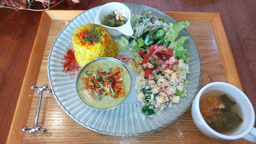 ドライカレーライスセットは小さなサラダとスープもついていたりランチにお腹いっぱい食べられるセットでした! ドライカレーは少しスパイシーで、ターメリックライスと一緒に食べてとても美味しかったです♪