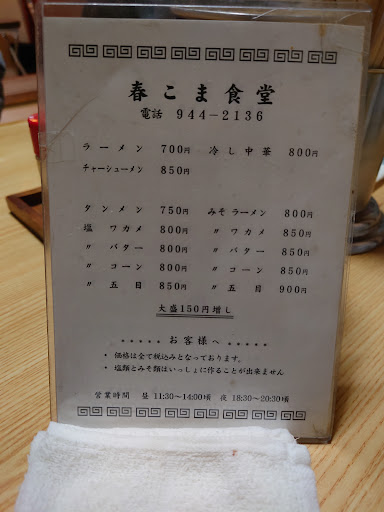 Read more春こま食堂@郡山市 タンメン750円 開店30分前2番。開店時15ぐらい。カウンター9席、小上がり1卓。メニューは醤油味のラーメンと、タンメン系、味噌󠄀ラーメン系のラーメン専門点。タンメンはベーススープに塩、胡椒のみで味付けした感じで、クリアで優しい味わい。麺は中太で少しちぢれがあるもので、すすり心地よく、もっちりした歯触りもありとても旨い。野菜も多めでタンメン的な満足度も高い。卓上の自家製辣油はしっかり辛く香り抜群で、タンメンに入れると、ぐっと中華によっていってとても良い。 接客も素晴らしくとても居心地の良いお店でした。名優が愛した理由がなんとなくわかる。 元祖郡山ブラックますや分店の味を守る最古参店の、春こまブラック🍜を近いうち 駐車場は店の...