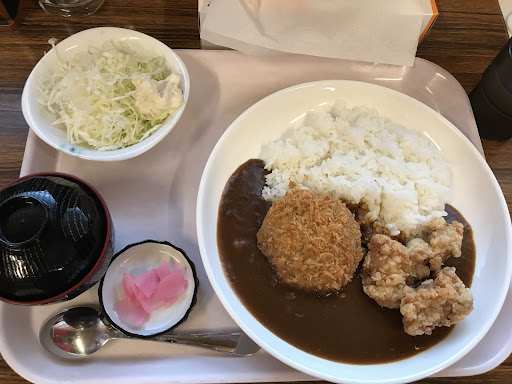 カレーライスに牛のメンチと唐揚げ2個。 メンチも唐揚げも美味しい。 サラダも付いてて700円。 ご飯大でもお値段変わらず、お得。