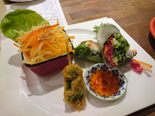 Lovely feel to this restaurant. Nice garden leading to it, an outside deck area (great ambience in the evening) and a counter area, apart from the inside seating. Food was really well presented, volume was plenty and they used coriander and lemongrass, for example, with some of the dishes. I had a special request vegan menu and all of it was delicious. A sign said they are locally grown fresh vegetables. This is a hidden gem. Go with no expectations, and I'm sure you will also have a lovely meal. Meat eating friends also enjoyed the regular...