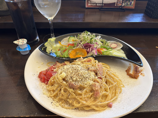 カルボナーラをチョイス ここでしか食べられない仙台味噌を使ったカルボナーラだ 麺の茹で方も絶妙 そして添えられたサラダは、新鮮で美味しい 盛られたお皿には、味噌もちょっと添えられいて、味噌だけの味も知ることができた 生クリームと味噌の相性抜群 これぞ日本人の日本人によるジャパニーズカルボナーラだ