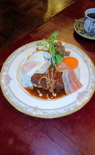 Read more最初に行きたかった所が臨時休業だったのでとりあえず行ってみた感じです🥺 入口から怪しい雰囲気…少し入るの戸惑いました😅 お店の前には旧いアメ車屋根にはヘリコプターと個性的な店構え! 店内に入っても更に個性的!ピアノからアクアリウムからレトロ感漂う不思議なお店😳 女性の店員さんが注文聞きに来てくれたんですが、メニュー見てたらめちゃくちゃ迷ってしまいました😵💫どれもこれも美味しそうで1つに絞れない…決まったら声掛けます!と言って下がって貰ったんですが暫くすると気を利かせてまた注文聞きに来てくれました!まだ迷っててすみませんでした🙇 お店オススメのハンバーグと連れはシーフードドリアを注文! 店内が雰囲気良かったので待ち時間に店内撮影会してました🤣 運ばれて来たお料理はどれも美味しくて大満足🙆ハンバーグソースが激ウマ!!付け合わせの野菜やスパゲティにつけつけして最後の最後までソースの味を堪能しました!最初に感じたお店の雰囲気と確かな味とのギャップがとても素敵で感動しました✨自信を持ってオススメ出来るお店ですね🙌次行ったらもうちょっと大...