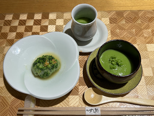 そして実際に頂いたのは以下の料理です。 ◯ブロッコリー with ウニ、えんどう豆 →鮮やかな緑色のプレゼンテーションが印象的でした。ブロッコリーに苦味や辛味が加えられた一品はユニークでした。またえんどう豆のスリ流しは、えんどう豆自体の甘みと香りを感じられた美味しい一品でした。