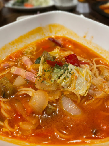 ファミレスなのでそんなにハードルを上げてもしょうがないですが。圧巻はミネストローネパスタ。こちらは大きな器に入っているスープパスタ。素晴らしいビジュアル。
