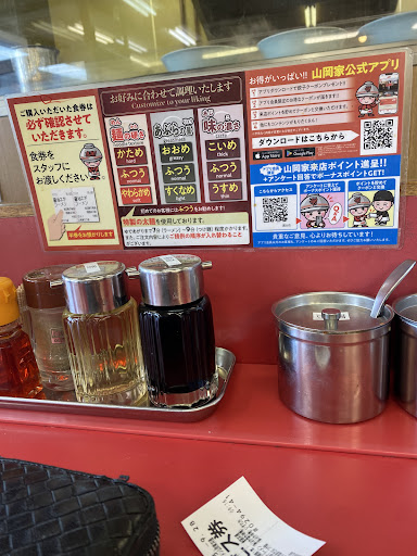 ラーメン山岡家の入り口に 券売機にて食事券を購入し 着席後に注文確認で麺の固さ 味の好みを確認後に提供する スタイルのラーメン店舗で、
